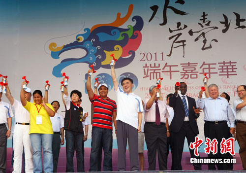 6月4日是台湾今年端午3天连假的首日,各地纷纷举办活动,多样精彩。图为4日下午,台北市长郝龙斌等鸣笛为“水岸台北2011端午嘉年华”揭幕。除165支龙舟队参与的龙舟赛外,嘉年华还规划了有美食与游戏的水岸市集嘉年华、合家参与的草地运动场、小朋友参与的夏日乐园,及包粽体验、接力立蛋祈福等活动。初夏的台北,民众乐融融。开幕式上,一对3年前因龙舟赛相识的恋人在众多民众见证与祝福中订下终身。