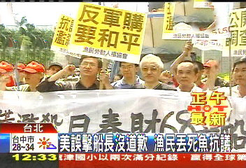 据报道,误击台湾渔民,美方至今没有道歉或是公开说法。从台湾各地赶来的渔民今日聚集到“美国在台协会”前抗议。他们把死鱼往“AIT”的方向丢,抗议美国军舰误击台籍渔船,被索马里海盗挟持的船长白白冤死。