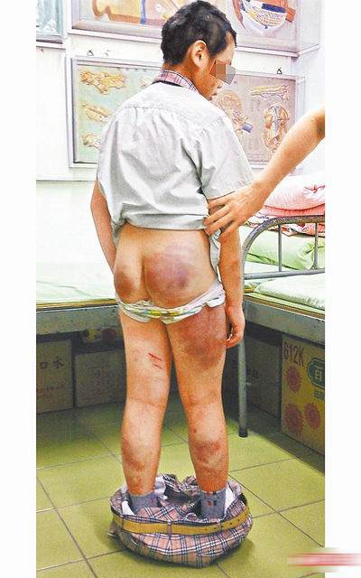 据小区邻居介绍,13日上午,见到男童一瘸一拐走到警卫室装开水,邻居上前询问,男童回答,“被父亲与继母用铁管、木条轮流殴打。”邻居见状非常心疼,愤而通报社会主管部门。邻居将男童送到学校后,才发现男童屁股及下半身都被打得瘀青红肿,惨不忍睹。