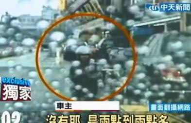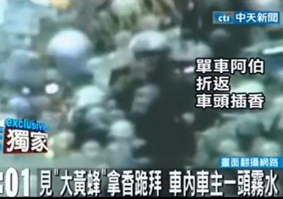 台湾一老伯当街插香跪拜跑车。图片来源:台湾中天电视台