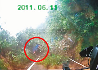 行车纪录器记录下当时的画面,连人带车坠下200米深谷,还能徒手爬上来,可谓是奇迹。图片来源:台湾联合新闻网
