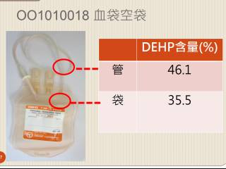 凌永健表示,以台湾捐血中心血袋保存的数据显示,只要血一入袋中,DEHP数值就会随着时间增加,与一般正常人血液相比,最高甚至可达1000倍,数字非常可怕。除了DEHP之外,这份调查报告物中受测物品中的“点滴输液套管”,也被验出有29.1%比重的DINP,其它包括“综合营养输注套”、“废液收集器”、“肾脏造口引流袋”等也被验出20%到30%不等的高比重DEHP。