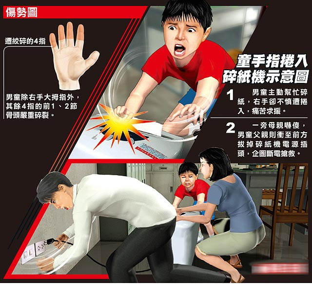 据台媒了解,焦姓男童的父亲因工作原因,带着妻儿回办公室整理物品,并将不需要的数据用碎纸机轧碎。男童疑因好奇,趁着父母不注意时,悄悄地将右手伸进碎纸机的走纸口内,没想到手指就遭卷进,男童痛得哇哇大叫;双亲看到儿子惨状,立刻向台湾消防部门求援。