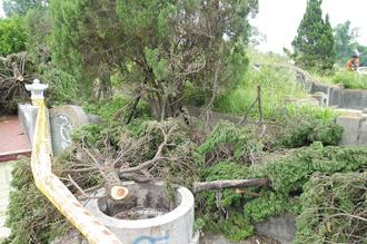 苏贞昌父亲墓园的六棵龙柏被盗,歹徒砍走了“龙柏心”树干,其余枝干散落一地。图片来自网络