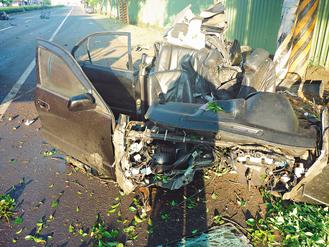 云林县林内乡外环道9日清晨发生自撞路树四死重大车祸,肇事轿车扭曲变形全毁。图片来源:台湾《联合报》