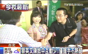 中国台湾网7月24日消息 据台湾TVBS电视台报道,民进党主席蔡英文昨(23日)晚参加“台湾北社”募款餐会,与陈水扁之子陈致中同桌,但两人互动平淡,只短暂握手。席间,双方各敬各的酒,蔡英文一直和游锡堃说话,陈致中则忙着跟妻子黄睿靓交谈。就餐结束后,蔡英文上台帮“北社”募款,但避谈是否与陈水扁切割。(中国台湾网 吴斌)