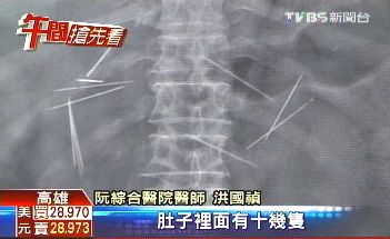 据报道,高雄市1名80岁的妇人感到腹部疼痛并且高烧不退紧急就医,医师检查后,发现老妇人胃部和十二指肠里有多处穿孔,其中1根针更是垂直穿破十二指肠,到达妇人的背部肌肉层,造成其静脉血管血栓,医师最后以开刀方式取出其中15根针,但垂直插入的针因不容易取出,只能放弃。