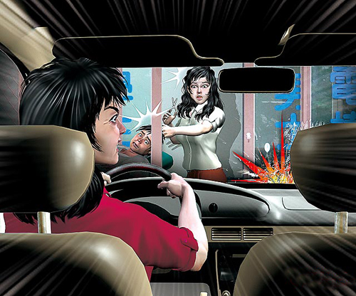 开车撞店示意图,陈姓妇人怀疑林姓女子是“小三”,开车冲撞美发店店门,让正在工作的林姓女子吓一 大跳。图片来源:台湾媒体