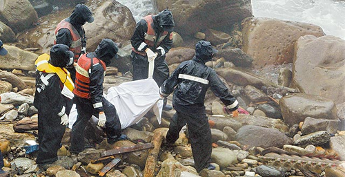 寻获遗体,台籍船长郭台生的遗体被浪打上岸,海巡人员以尸袋装裹。(图片来源:台湾媒体)