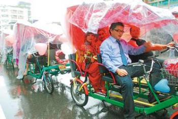 中国台湾网10月10日消息 据台湾《联合报》报道,昨天,宜兰市民陈信宏冒雨迎娶相恋3年多的女友钟佩娟,两人身着大红色古装礼服,以双人协力车为礼车。特殊的礼车车队行经宜兰市区,引人注目,不少路人都给予新人祝福。