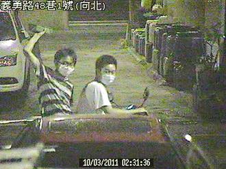 监视器拍下砸车过程,图中两名少年拿砖头正准备砸车。(图片来源:台湾《联合报》)
