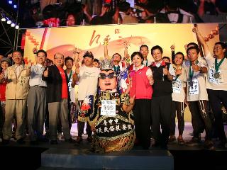 台湾九天民俗技艺团的团员们轮流背着重达17公斤重的三太子神偶,7天横越250公里的撒哈拉沙漠,12日返台,台中市政府安排盛大的欢迎仪式。图片来自台湾媒体