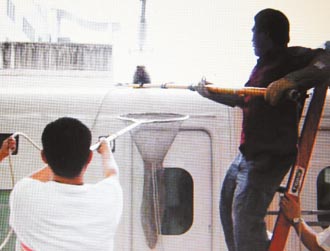 这只猕猴大闹三小时后,围捕人员射出四支麻醉箭,猕猴中箭跌落高铁车厢上。(图片来源:台湾《联合报》)