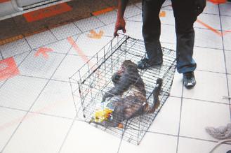 高雄市消防局表示,昨天上午九时九分,左营站员工发现第三站台内侧梁柱上有只猕猴乱窜,立即出动多人,携带捕兽夹、捕兽网及铁笼赶往。猕猴非常机警,见一群人“来意非善”,在站台梁柱间跳来荡去,再由站台外侧往大厅梁柱移动,把后面“始终慢一步”的围捕人员急得团团转。 围捕人员力斗不过想智取,拿出香蕉诱捕,猕猴跳下来捡起香蕉大口吃,但围捕人员靠近,猕猴立即跳上梁柱,乱得他们只好干瞪眼。