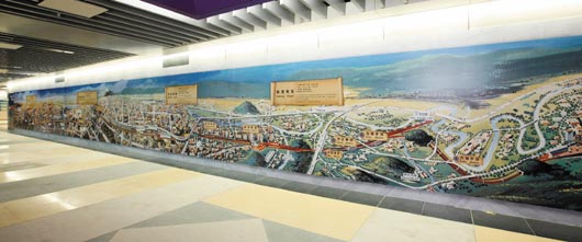 衔接捷运南港站与台铁南港站的通廊上,藏有一幅长达25.5公尺、素有“地铁版清明上河图”之称的铁路立体化工程图。铁工局表示,这幅工程图绘制耗时28年,当切割为四阶段的大台北都会区铁路立体化工程陆续完工,每完成一段,立体化工程图便跟着添一笔。