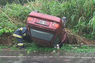 “咦?人咧?”警消人员获报赶到车祸现场搜救,只见车子翻覆在田埂,担心驾驶和乘客跌落猫罗溪,四处搜救,过一会儿,林男才走出来自称乘客,还说车上的女性驾驶已经离开,但迟迟不肯说明白。