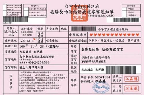 江嘉胜与黄怡伦的喜帖搞kuso,仿交通罚单的颜色与格式,充满创意。(图片来源:台湾《联合报》)