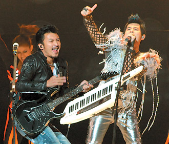 周杰伦(右)高雄演唱会,昨一开场便与谢霆锋互飙乐器,台下歌迷尖叫。(图片来源:台湾《联合报》)
