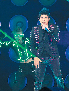 周杰伦高雄演唱会,周杰伦(右)与舞群穿着LED炫闪装,十分吸睛。(图片来源:台湾《联合报》)