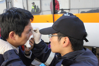 出事的太鲁阁号列车的列车长(左)的头部受伤,坚持留在现场未就医,桃园县政府消防局救护员现场为他上药。(图片来自台湾媒体)