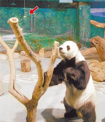 图为熊猫团团。台北动物园将苹果(箭头处)悬挂于半空,训练团团的腿力和腰力,从而提高交配成功率。(图片来源于:台湾《苹果日报》)