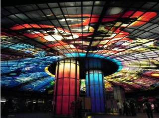 据报道,美丽岛站是高雄地铁最大站,同时也是目前世界上最大的圆形车站。其圆形设计出自日本设计师高松伸之手,以4000多片彩绘玻璃组成,用缤纷的色彩描绘浩瀚宇宙,被命名为“光之穹顶”,是目前世界上最大的单一玻璃公共艺术品。
