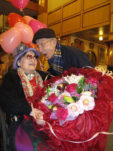 嘉义市90岁老翁蔡戊田(右)、与87岁的妻子黄华月(左)结婚64年,于13日情人节前夕再度约会,蔡戊田出其不意,献上超大的情人花束,让黄华月感动又开心。 图片来源:台湾“中央社”