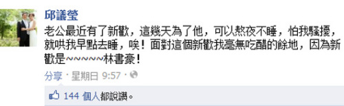 罹患卵巢癌、正在化疗的的民进党籍“立委”邱议莹,12日在脸书PO文说,“老公最近有新欢,为了他可以熬夜晚睡,怕我骚扰,就哄我去睡。面对这个新欢,我毫无吃醋的余地,因为对象是林书豪”。有网友回应,NBA寡妇又一位;有网友安慰她要看开一点。