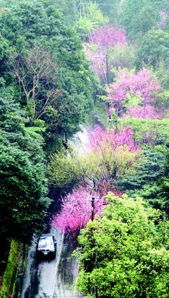 连续四天假期,全台著名赏樱景点一路塞塞塞,其实只要不随着人群走,各地仍有不少私房赏樱景点,如图中这个乌来山上,成排樱花树,民众可下车在细雨中漫步赏樱。(图片来自台湾媒体)