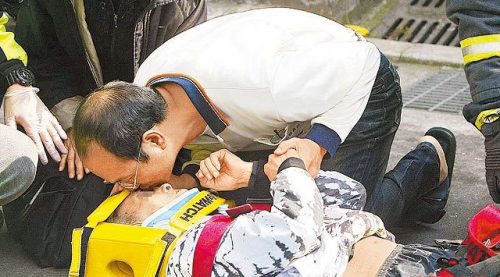 中国台湾网3月31日消息 据台湾媒体报道,新北巿一名七旬老翁疑因久病厌世,昨凌晨趁家人熟睡时,从住处14楼跳楼轻生,撞破1楼的平房屋顶,卡在洞内当场死亡。死者儿媳清晨发现父亲失踪后报警找人,接获通知找到父亲遗体,儿子难过得跪地痛哭,俯身亲吻父亲额头道别,场面令人鼻酸。 (中国台湾网 李迪)