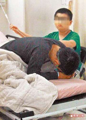 何姓男子的小儿子在医院内,像个小大人似的照顾已清醒的父亲。 图片来源:台湾媒体