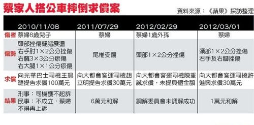 对于蔡妇指控对象皆集中大都会客运287、281路线公交车,让司机“闻蔡色变”一事,大都会公交车保安课襄理高灿煌证实此事,并表示因车厢内未装设监视器,无法了解蔡妇摔倒的情形,经协调后,司机自掏腰包分别赔了6万元及1万元和解,目前还有一案尚在协调中。大都会东湖站司机一肚子苦水,他们说,知道这么多同事被她(跌倒姐)告,当看到她上车,就要小心一点,并会相互提醒,但也不会因为注意她一个人,而忽略全车安全;大家都很怕载到她,但又不能拒载,真的很无奈!
