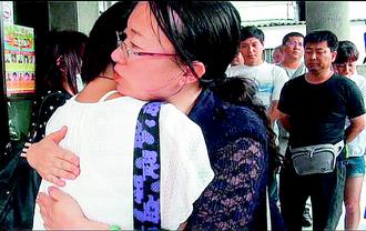 大陆领队叶云(拥抱者右)轻拥驾驶的女儿劝慰:“你要坚强、要照顾妈妈。”后面的团员都红了眼眶。图片来自台媒