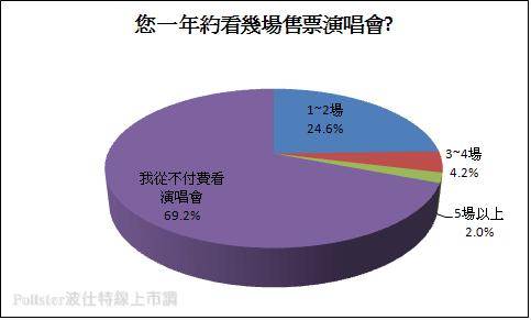 “一年中看几场售票演唱会”调查结果显示,69.2%从不付费看演唱会、24.6%一年看1至2场、4.2%看3至4场、2%看5场以上。从结果分析,一般民众对于售票演唱会接受度不高,有2成1年看1至2场演唱会,可见“付费演唱会”对民众仍属较奢侈活动。但可能因为特别喜爱歌手、或偶尔休闲娱乐活动而购票参与;仅少数民众在“付费演唱会”的参与度表现热衷。
