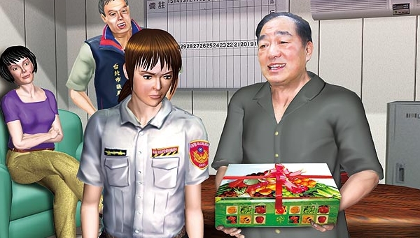 2.基隆市长张通荣与议员沈义传赶到分驻所,以廖女是精神病患为由,要女警原谅她,并送上水果礼盒。