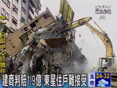 中国台湾网9月22日消息 据台湾“东森新闻网” 报道,昨天是台湾9·21大地震13周年纪念日,当年的9·21大地震造成台北东星大楼倒塌,共87人死亡。如今,这起由大地震造成的民事官司在打了整整12年之后,于21号下午宣判。台北地方法院一审判定,鸿固营建需要赔偿住户总共1亿9000多万元(新台币 下同),但面对这样的结果,住户们无法接受,决定再上诉。