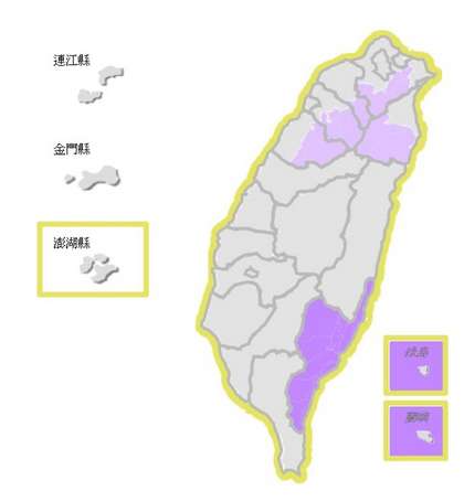 台湾“气象局”发大雨特报(紫色)和强风特报(黄色)。图片来源:翻摄网络