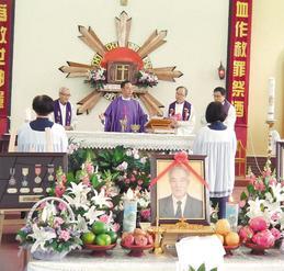 主教座堂神父浦英雄为他主持弥撒,家属及教友参与圣道礼仪,唱圣歌追思,各界来宾吊祭,场面哀荣,骨灰安厝教会圣山墓园。