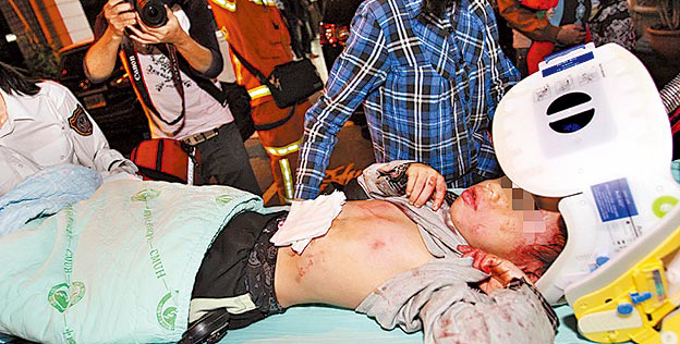 台湾一男子因同居女友分手,挟持并刺伤亲生幼儿,目击男子(左)气得抓着他的头挥拳。(图片来源:台湾《联合报》)