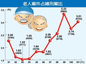 据台“警政署”统计,台湾老年人犯罪案例已从2002年的4000多件,增加到去年的近7000件,其中,2010年的8000多件算是最高峰。