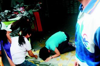 死者家属到施姓男子家中撒冥纸,施某母亲(蓝衣)下跪向家属道歉,表示会全权负责。图片来源:台湾《联合报》
