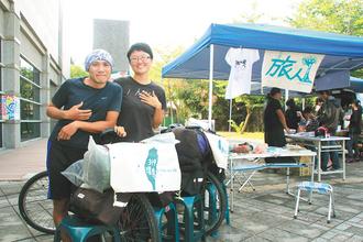 情侣档鲁睿宁(左)、郭嘉吟骑单车环岛旅行,昨天在嘉义市创意市集,分享生命故事。图片来源:台湾《联合报》