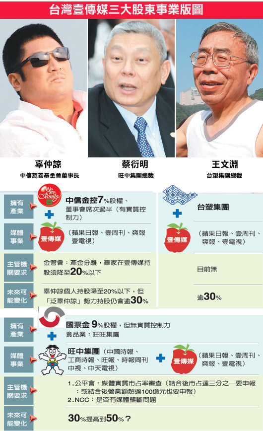 台当局“金管会”要求辜仲谅,投资壹传媒,持股必须低于20%、完全不能涉入壹传媒的经营、也不能担任买家代表人与壹传媒大股东黎智英签约。