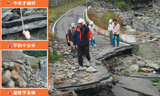 中国台湾网12月4日消息 据台湾《联合报》报道,台湾南投县长李朝卿涉嫌向承包商索贿弊案延烧,台当局“公共工程委员会”昨(3日)到信义乡神木村抽测联外道路,发现路面沥青厚度不够,挡土墙灌浆不足,到处可见的坑洞有如豆腐渣,摇头直说:“目测就知有瑕疵,怎么抵挡风灾?”
