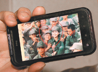 当年幸运被邓丽君献吻的薛进友,将他与邓丽君的合影放进手机随身携带。图自台湾《联合报》