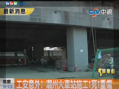 据悉,潮州站的高架化工程,今天进行的是钢板屋顶的部分,由于屋顶已大武山为意象,设计为波浪造型,增加工程的困难度。两名工人共抬1块波浪板要架设屋顶时,不慎摔落,其中62岁的戴姓男子送到医院前已无生命迹象,另名吴姓男子左大腿、颅骨骨折,没有生命危险。