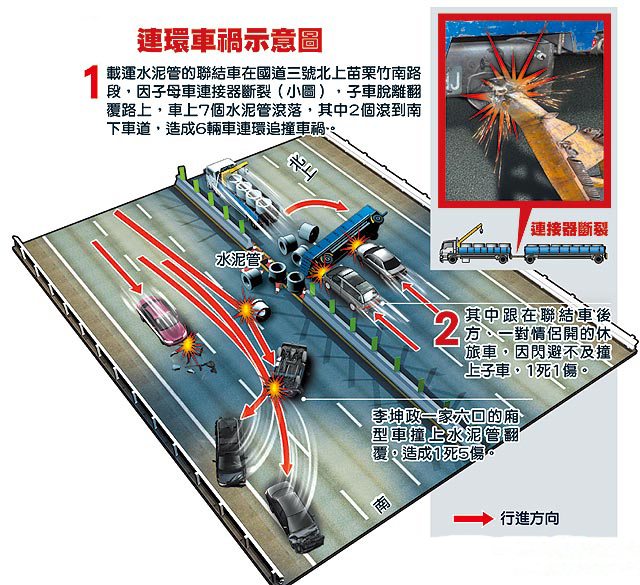 中国台湾网2月23日消息 据台湾媒体报道,台湾昨日发生一起破坏力有如电影《绝命终结站》翻版的车祸,一辆载运巨形水泥管的联接车昨日清晨在一处公路行驶,途中疑因子母车连接器平日保养维护不当而断裂,子车脱离后翻覆于公路上,车体横在路面,车上7个水泥管2个滚到路面另一侧车道,导致南北双向共6车受撞击,连环受损,酿成2死6轻重伤的悲剧。