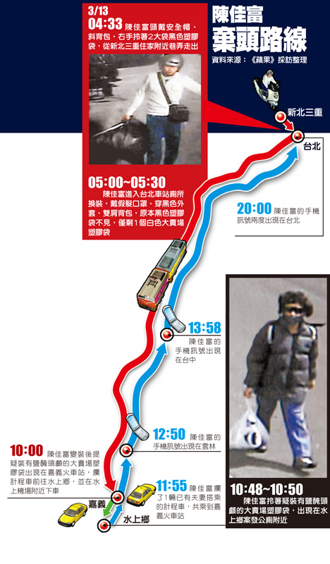 检警昨表示,经调阅台北车站监视画面,13日凌晨4时,陈佳富拎着两大袋黑色塑料袋外出,随后在台北车站现身,再进入车站厕所换装,走出时已戴假发与口罩、穿上黑色厚重外套、双肩背包变装,手上两个黑色塑料袋消失不见,右手仅拎着一个白色大卖场塑料袋,与嘉义公厕的监视影像相符。此外,监视器也拍下他以上述装扮,站在台铁第3月台候车,搭乘清晨列车南下,上午约10时出现在嘉义县,证实他搭火车带着头颅到水上乡丢弃。