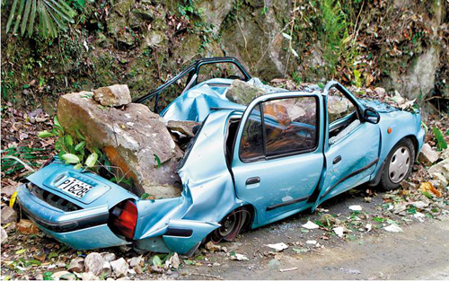 南投强震,草屯镇双冬山区一辆小轿车被落石砸扁,幸驾驶仅肩颈受伤。(图片来自台媒)