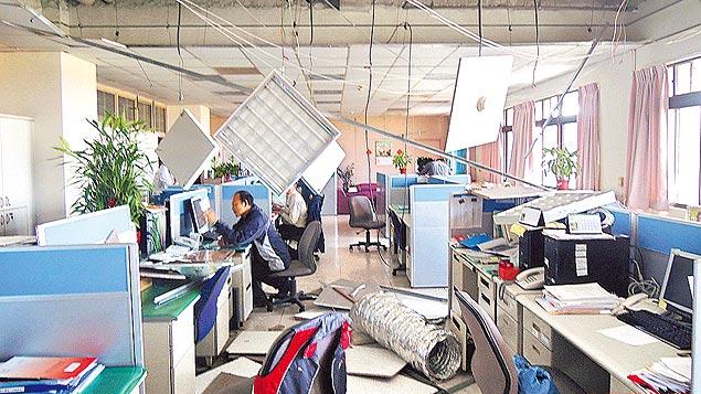 【凌乱不堪】台中市政府阳明大楼五楼办公室,在地震剧烈摇晃下,天花板掉落一大片。(图片来自台媒)